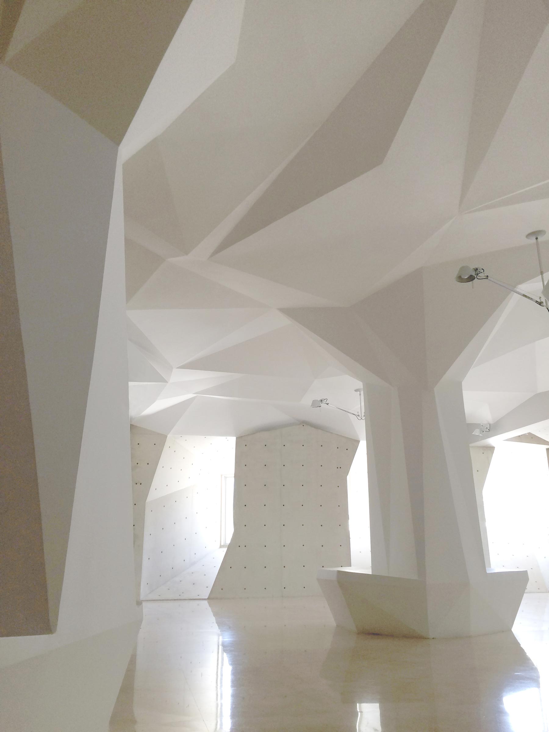 Patients who enter the clinic are also treated to a concrete interior that is as unique as the exterior façade, with geometric shapes on a floating ceiling that alludes to the palate